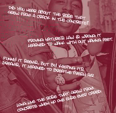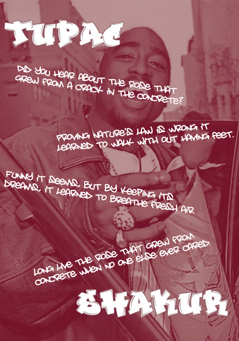 Découvrez comment j’ai donné vie au poème iconique de Tupac « The Rose That Grew from Concrete » through a powerful visual combining falling text, an iconic photo of Tupac in New York, and a symbolic dominant red color. Ce post explore le message de résilience, d’espoir et de beauté qui transcende les environnements difficiles, illustré par chaque détail de cette création unique. Dive into the world where poetry and graphic design meet.